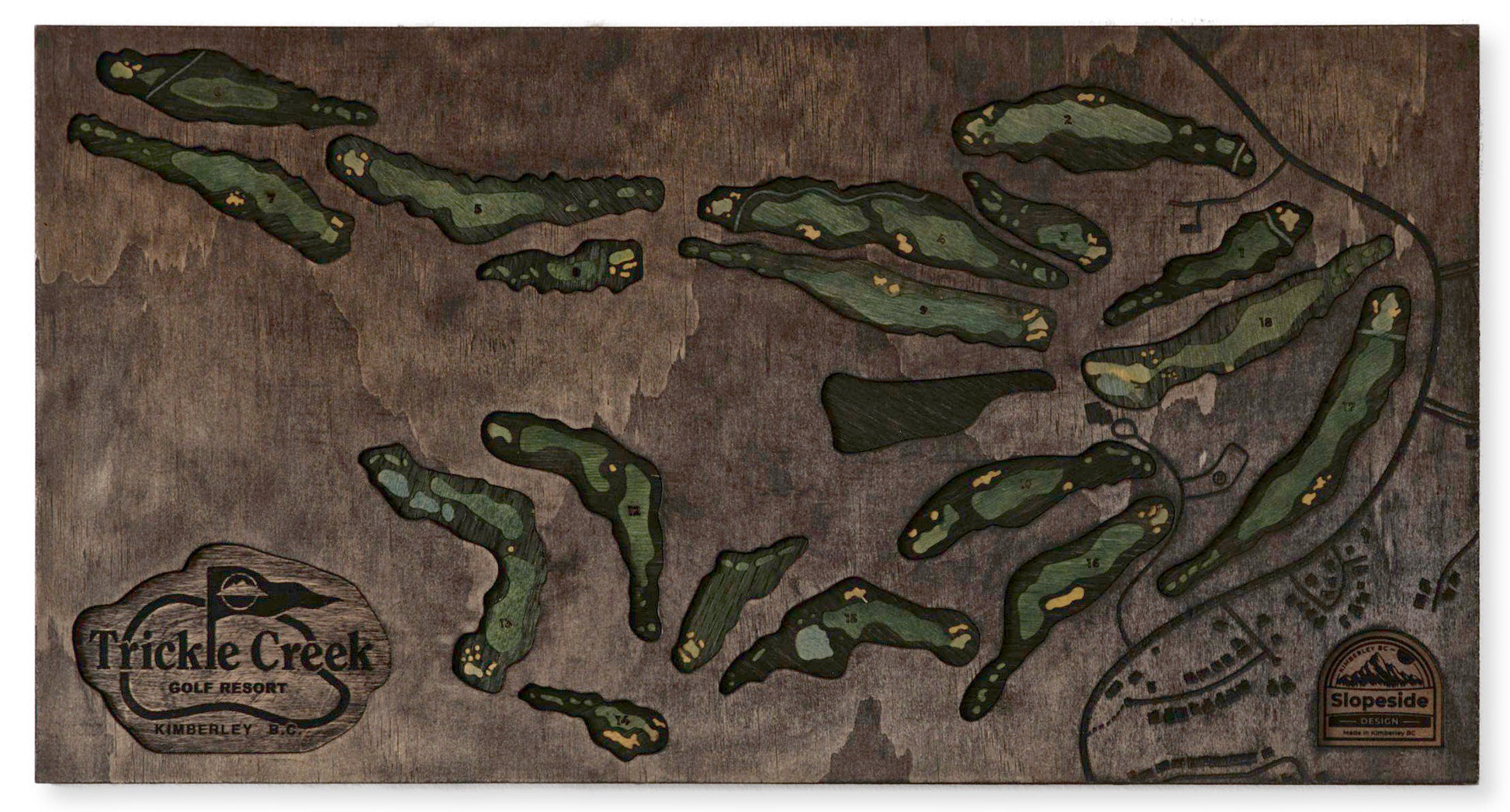 A 2D map of Trickle Creek featuring a colored wooden inlay to highlight the golf holes and features.